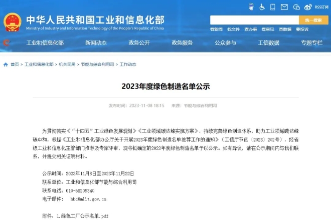 為貫徹落實《“十四五”工業綠色發展規劃》《工業領域碳達峰實施方案》,持續完善綠色制造體系,助力工業領域碳達峰碳中和,根據《工業和信息化部辦公廳關于開展2023年度綠色制造名單推薦工作的通知》(工信廳節函〔2023〕202號),經省級工業和信息化主管部門推薦及專家評審,工業和信息化部節能與綜合利用司擬定并公示了2023年度綠色制造名單。
