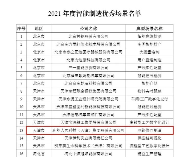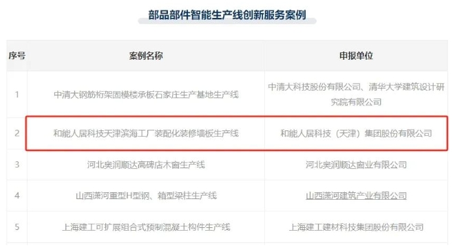 和能人居科技于2018年啟動天津濱海制造工廠數字化、智能化改造,目前天津濱海智能制造產線,是全球領先的全屋部品體系智能制造工廠。濱海智能制造工廠創新采用了實體工廠與數字工廠雙工廠運營模式,通過云計算等創新技術實現了信息化和工業化深度融合使得和能全國工廠能協同運作,打造出國內首個裝配式裝修工業互聯網。